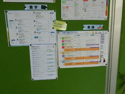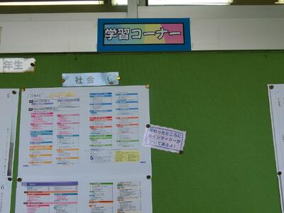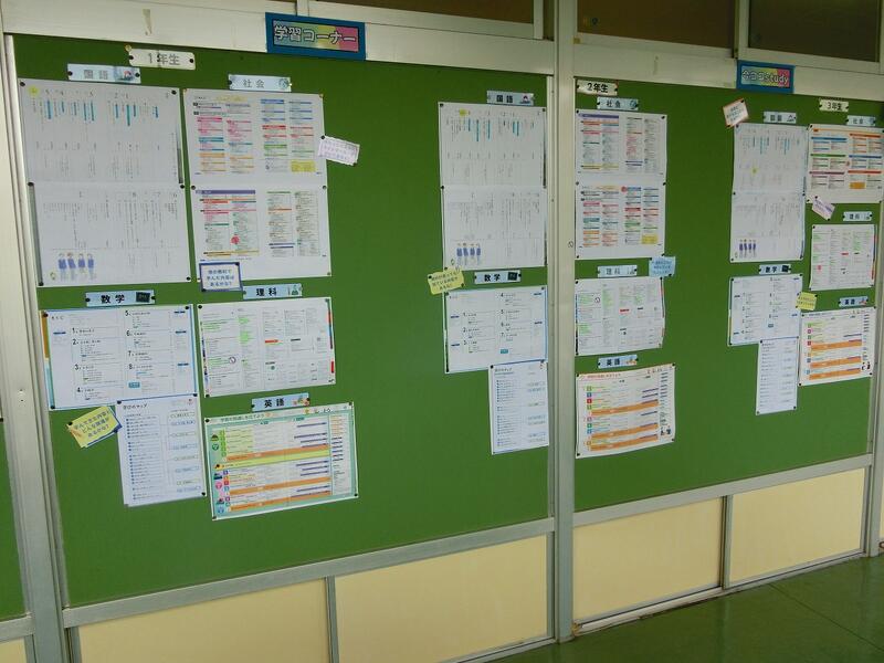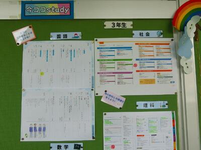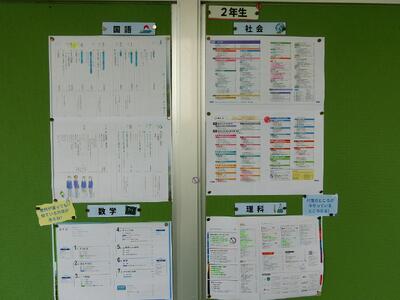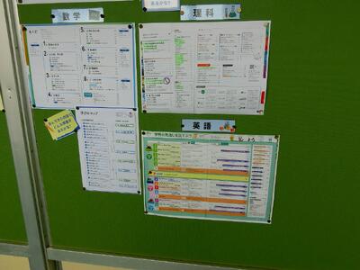 テストに備えて「学習コーナー」には、各教科係が先生に質問した、テスト攻略法のアドバイスが貼られています。