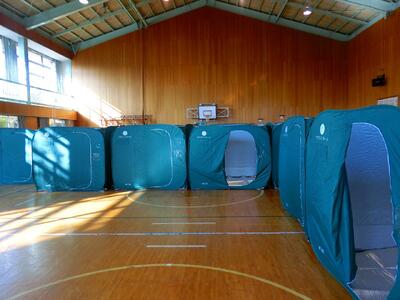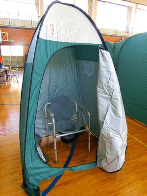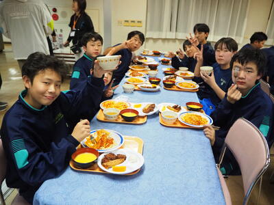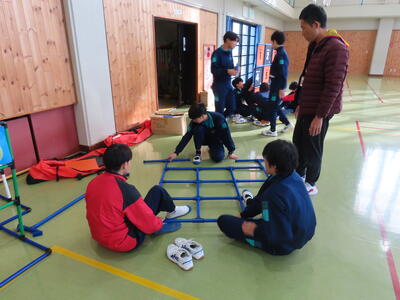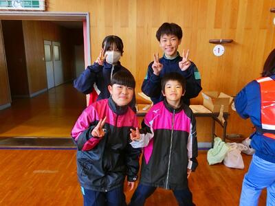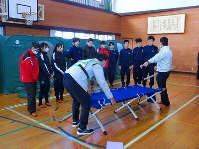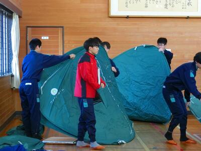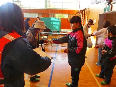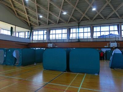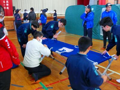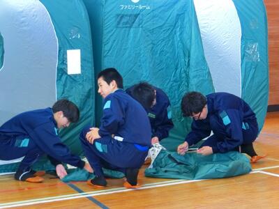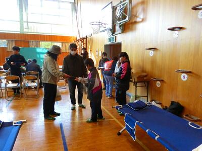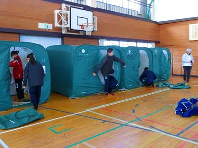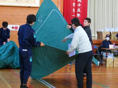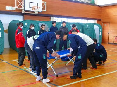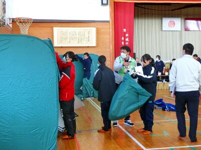 避難し、避難所のテントやベットの設営や非常食を配布するなど、中学生参加者も市職員の方の運営にボランティアとして一緒に活動しました。