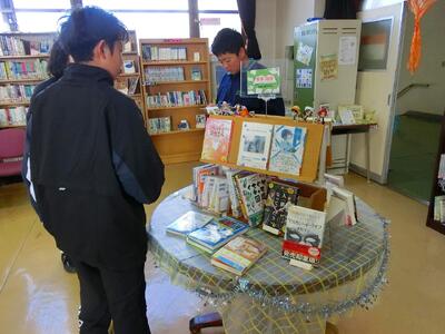 図書室で読書に親しめるように司書の先生と図書ボランティアさんが新書やおすすめの本の紹介など、選書コーナーをたくさん工夫してくださっています。ありがとうございます。