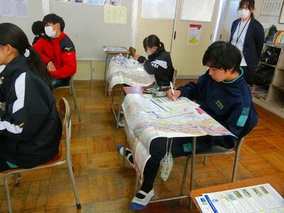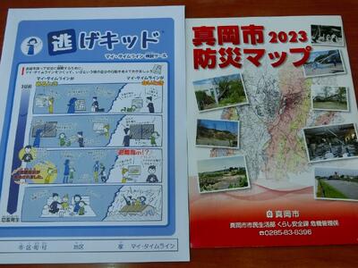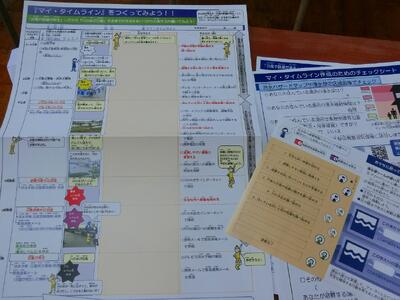 真岡市の防災マップをもとに、自分の住んでいる地区が台風時などの予想される浸水深について知り、避難するまでのタイムスケジュール「マイタイムライン」を考えてみる活動でした。