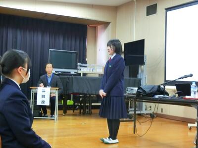 生徒会長立候補者 2年生4名、生徒会副会長立候補者 1年生3名、それぞれが全校生徒を前にして、次年度に向けてよりよい物部中学校にしていくための自分自身の生徒会活動への思いや考えを堂々と述べました。