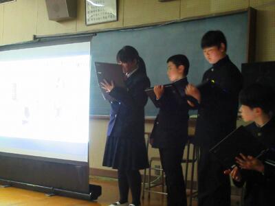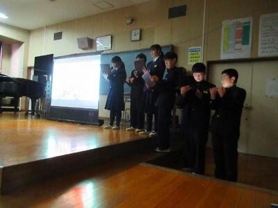 生徒に実施したアンケート結果説明や校則の〇✖クイズ、冬休みの過ごし方の注意点や自転車の点検について、大事なお知らせがたくさんある発表でした。しっかり心に留めて、事故やケガなく安全で楽しい冬休みを過ごしましょう。