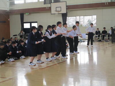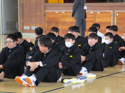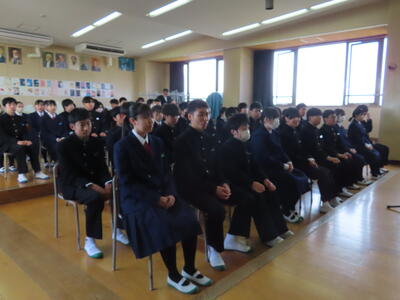 校長先生からのお話では、物部中学校の創立に関わるクイズに生徒みんなで答えながら、物部中の成り立ちや変遷などの歴史について知ることができました。
