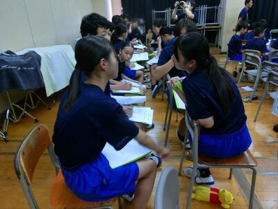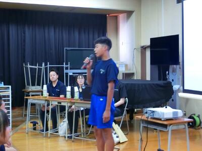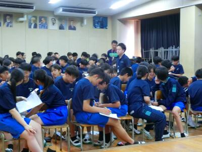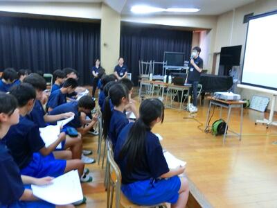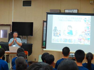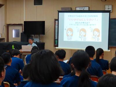 物部中生徒のスマホ利用の実情や海外のSNSの法的規制の現状、スマホの四大リスクなど、統計などをもとにしてわかりやすく説明をしてくださいました。また、自分なりに使用時のルールを決めたら、それをどうしたら守れるかを考え、守れる具体策を講じることが大切、と伝えていました。
