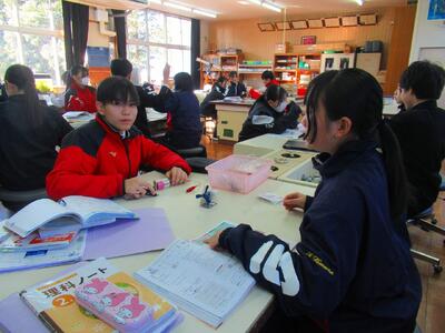授業の様子 投稿日時 : 12/19 物部中 【1年生 国語】 本のポップを書くために、お気に入りの本を探して、アイデアを練っていました。 【2年生 理科】 実物で回路を作って確認しながら、回路図を書いていました。