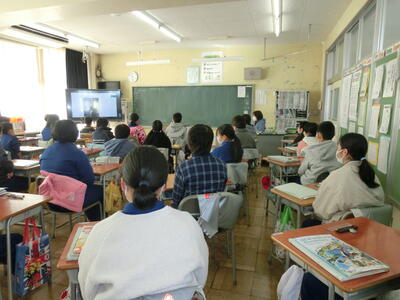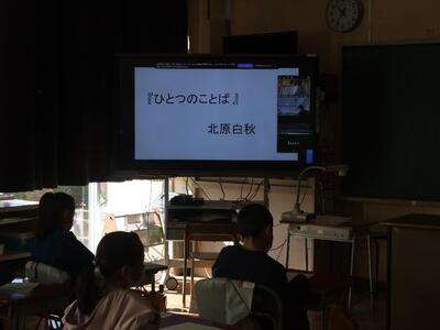 また、昼休みには、「百羽のツル」についての感想発表をもとにそれぞれが考えたことを話すという、読書会を開きました。そこでは、児童から 子供のツルが助けを呼ばなかったこと、九十九羽のツルが一斉に助けに降りて行ったことなど感動した場面の発表があり、その後の話合いで、どちらも相手を思いやる心があるところが同じだと気付きました。