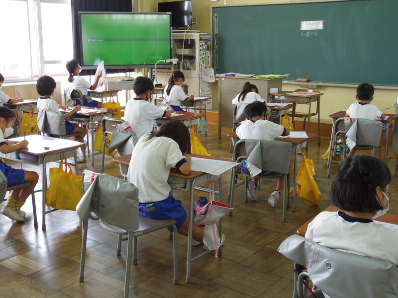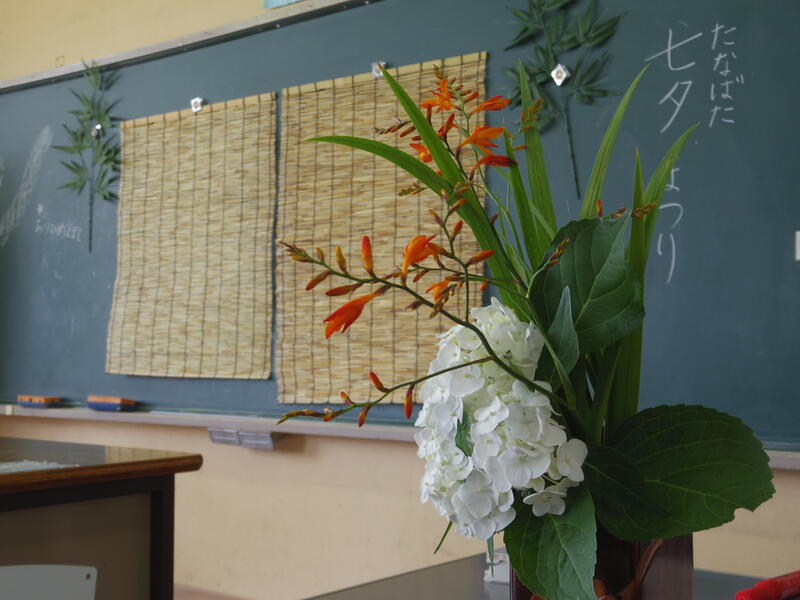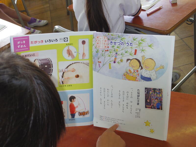 前面黒板に笹の葉やすだれが飾られており、七夕の情緒たっぷりの環境のもと、1年生のかわいらしい歌声が流れていました。