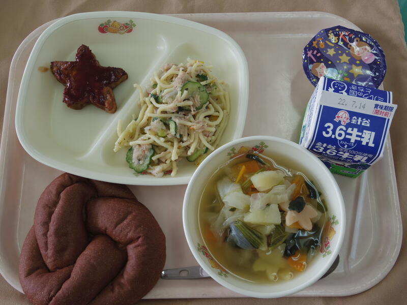 星型ハンバーグのケチャップソース、バジルパスタサラダ、星かまぼこ入りスープ、七夕ゼリー