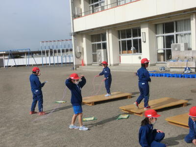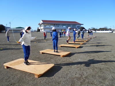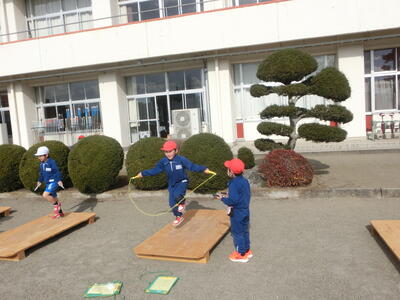 まずは、1年生です。1年生は体育の授業で、縄跳びを行いました。ジャンピングボードを使い、休み時間にも練習しているせいか、とっても上手になりました。1年間で、ずいぶん成長した姿が見られました。