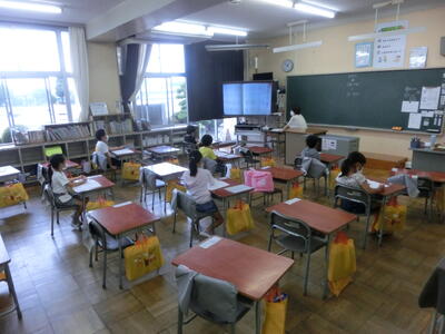 今日はA班の分散登校日です。全員が休みなく登校することができました。明日はB班です。元気に登校してくださいね。