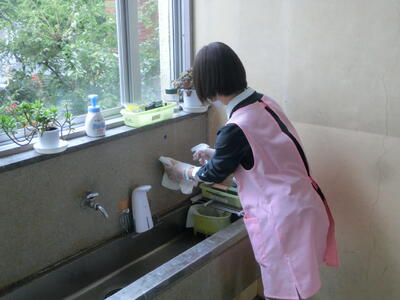 児童がよく手を触れる箇所(ドアノブ、手すり、スイッチ、トイレ、水道など)は、清掃時や放課後を利用して、今まで以上に入念に職員が消毒作業を行っています。