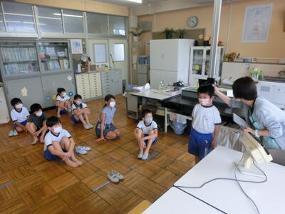 新型コロナウイルス感染症対策について、養護教諭が校内放送で児童に話をしました。特に、(1)マスクの着用や密を避けること(2)手洗いや手指の消毒について(3)教室の換気について 具体的に説明しました。