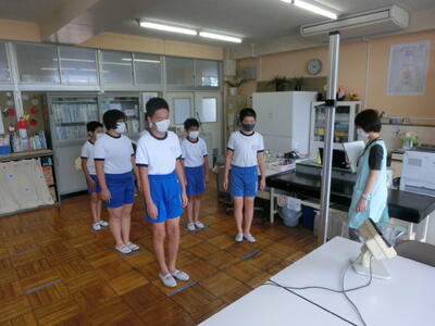 今日はB班の分散登校の日です。全員が休まず登校することができました。身体計測では、ソーシャルディスタンスを保ち、きちんと整列、測定していました。