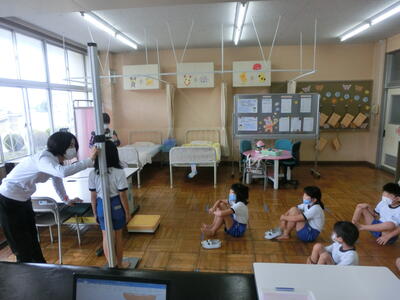 今日はA班の分散登校の日です。身体計測を行いました。きちんと静かに整列し、測定することができました。