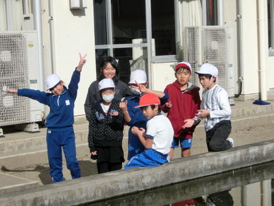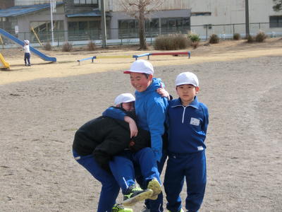 学級閉鎖が解除され、昼休みには上級生と下級生が仲良く元気に遊んでいました。