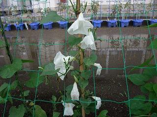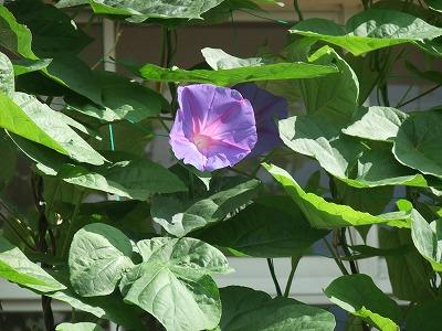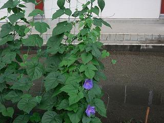 真夏の太陽の光をいっぱいにあびながら、3か所ともぐんぐん伸びています。2階のベランダに到達したところもあります。生命力のすばらしさを感じます。朝顔の花が、るり色に輝いていました。