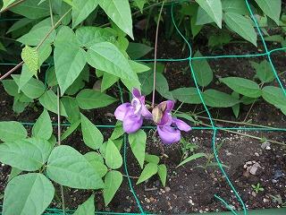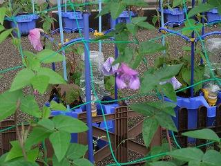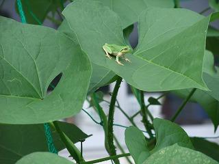 朝顔もスイートピーも空に向かってぐんぐん伸びています。緑の色もずいぶん濃くなりました。ちょこんと葉っぱに乗って、風にふかれているカエルさんを見つけました。かわいいスイートピーの花も咲いています。