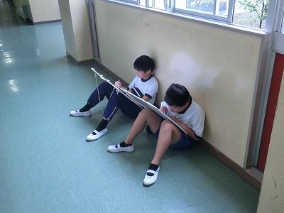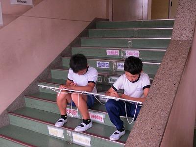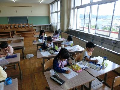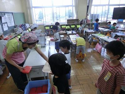 空調設備(エアコン)の関係で、1年2組の児童は空き教室である資料室(2階)で学習しています。授業(算数)や給食の準備もしっかり行っていました。安全面に十分注意して、生活させたいと思います。