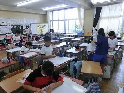 今日は朝から雨です。6年生は図工の授業で、「大切な場所」というテーマでスケッチを行っていました。室内の作業でしたが、全員が真剣に取り組んでいました。