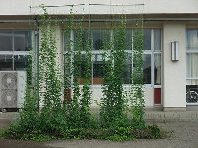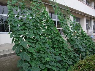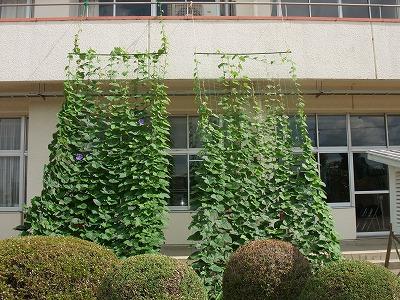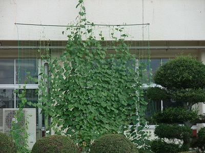 夏休み中、3つのグリーンカーテンたちはすくすくと育ち、遠くから見ると緑の大きな生き物のようです。