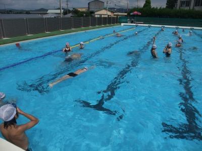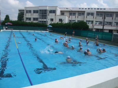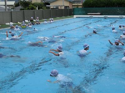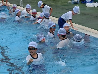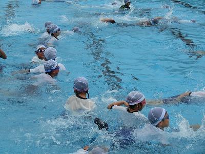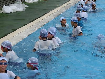 3,4年生が着衣水泳を行いました。これは、万が一服を着て水難事故にあった場合、どのように対応したらよいのか、どのように助けを求めたらよいのかをプールの中で学習するものです。