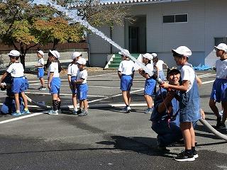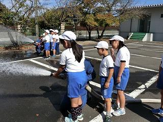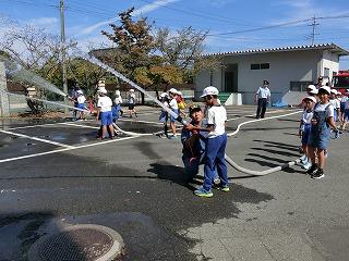 消防団活動について話を聞いた後、実際に消防団の方の指導で消防服を着用したり、放水体験をしたりしました。また、操法訓練の見学もしました。