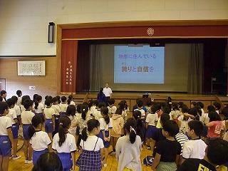 物部小学校は、10月5日に145歳の誕生日を迎えます。それに先立ち、10月2日(水)に創立記念集会を開きました。今回は、物部小の大先輩でいらっしゃる長岡曻栄先生にご講話をいただきました。「二宮尊徳先生と物部」という題のお話は、分かりやすく、物部への思いのつまったすばらしいものでした。