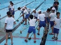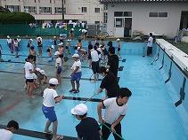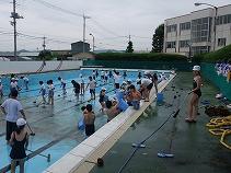 近づく水泳シーズンに向けて、今日はプール清掃がありました。曇天で肌寒さも感じるなか、5・6年生がびしょ濡