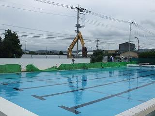 大地震で倒壊する恐れがあるということで、プールのブロック塀の撤去工事が始まりました。2日間で撤去し、仮設のフェンスを取り付ける予定です。正式のフェンスについては、プールの使用期間後に設置する予定です。