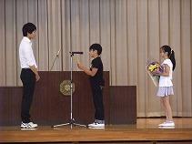 後に小森先生の離任式を行い、児童代表のお別れの言葉と花束贈呈をしました。新天地での御活躍を期待していま