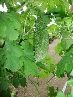 夏の暑い日差しを浴びて、おいしそうなゴーヤがなりました。葉もふさふさしています。