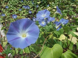 特に、オカワカメは葉数も多く生き生きとしています。朝顔(天空の蒼)もきれいに咲き誇っています。