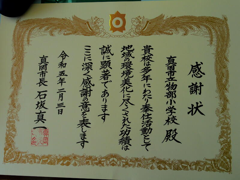 1つ目は、これまで取り組んできた小中合同での環境美化活動が認められ、市から感謝状をいただたこと