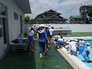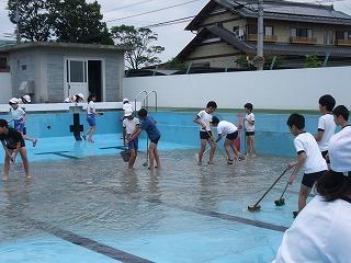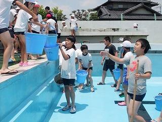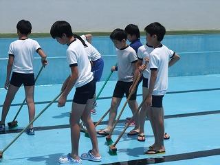 5・6年生によるプール清掃がありました。きれいになったプールにさっそく水も入り、もうすぐプールの季節がやって