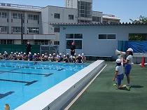 業間にプール開きが行われ、さっそく3校時に5・6年生が泳ぎました。まだ水温が低めでしたが、元気な声が響