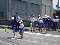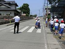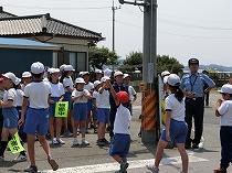 交通安全教室では、登校班ごとに学校の近くの信号機や横断歩道の渡り方の練習を行いました。