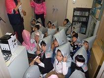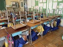 竜巻を想定した避難訓練を行いました。窓のない場所に避難したり、椅子を移動して机を壁に寄せて固めたシェル