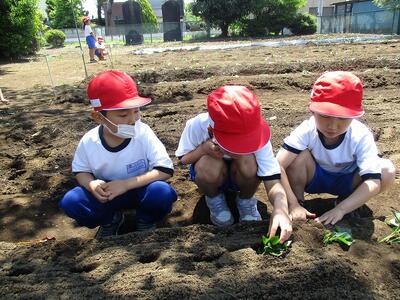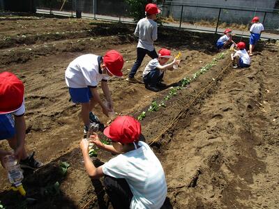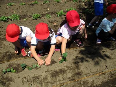 用務員さんが立てて下さった畝に、さつまの苗を植えました。苗の茎を土の中に斜めに入れて、水をたっぷりあげました。美味しいおいもができるといいですね。