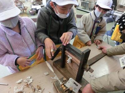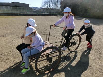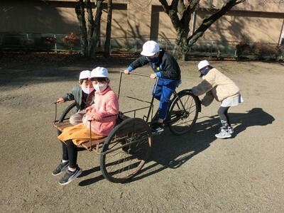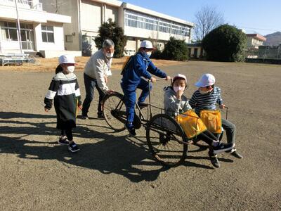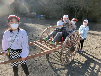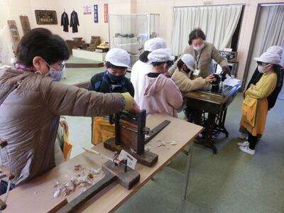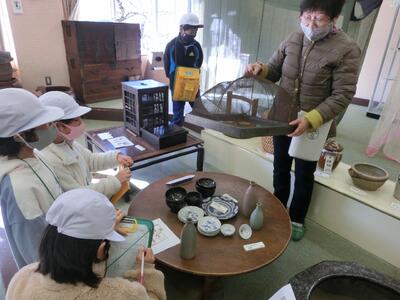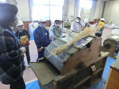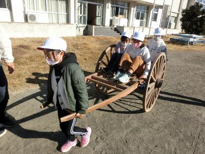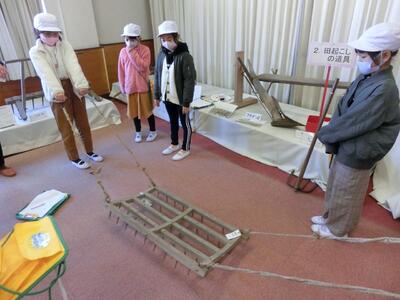 12月8日に、社会科見学で旧高田分校の歴史資料保存館に行ってきました。昔の農具や生活民具を見たり触ったり、荷車体験をしたりして、昔の人の生活の様子を学びました。
