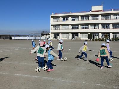 体育の授業で、ラインサッカーをやりました。最初に、個人戦でドリブルおにごっこをしました。それぞれの児童が自分のボールをドリブルして守りながら、相手のボールを外に蹴って出します。半分以上の児童が相手のボールを外に出すことができました。次に、4チームに分かれて試合を行いました。寒い中でも、夢中になってボールをおいかけたり、いいプレーをした友達に声をかけたりして、積極的に取り組んでいました。