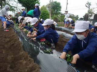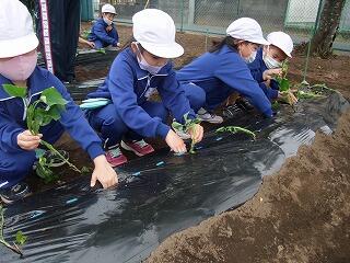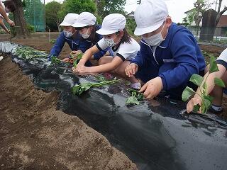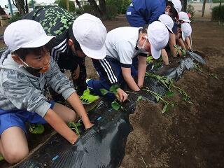 昨年度はできなかったさつまいものの苗植えができて、みんな大喜びです。3畝にマルチをかけて苗を植えました。さつまいもほりが楽しみですね!