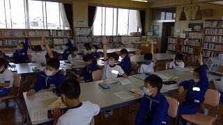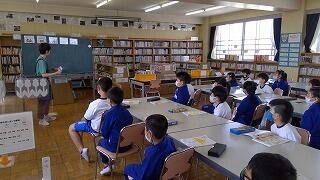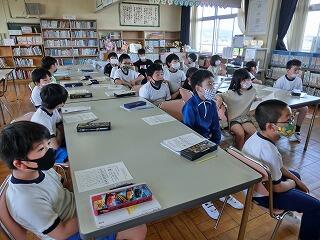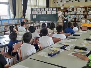 国語の「図書館へ行こう」の学習で、学校司書の先生に本の分け方やラベルの見方、図書室の使い方について教えていただきました。