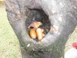 外でもたくさん遊びました。「あれ、がまくんとかえるくんがいるよ。」木のくぼみにかえるがなかよく寝ていました。