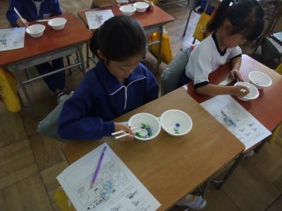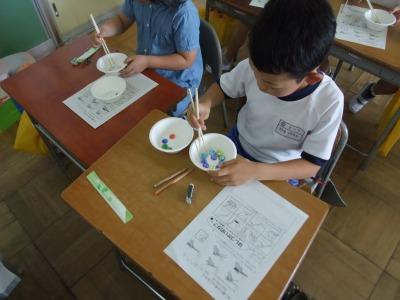 「はしの正しい使い方を知ろう」というテーマで、はしの正しい上手な持ち方について確認し、実際にはしとおはじきを使って練習しました。