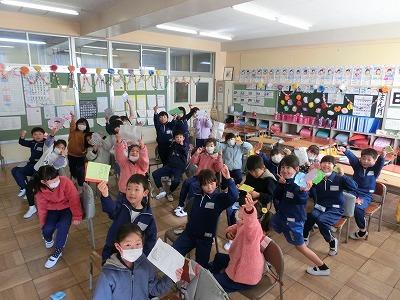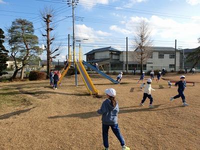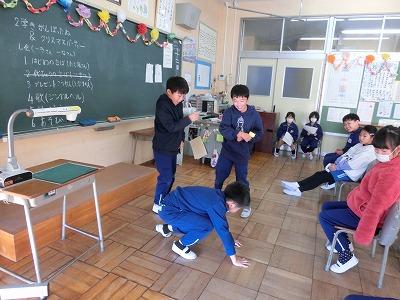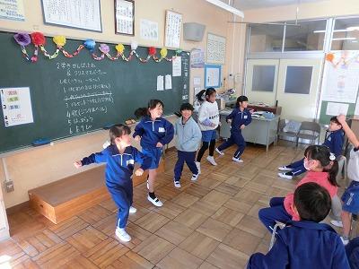 手作り作品のプレゼント交換や、出し物の発表をした後、教室内や校庭で遊びました。