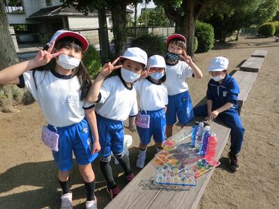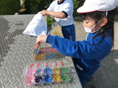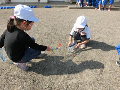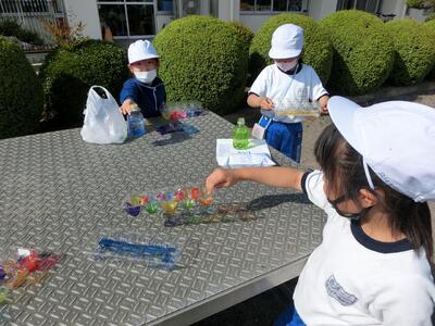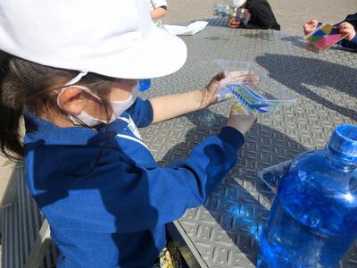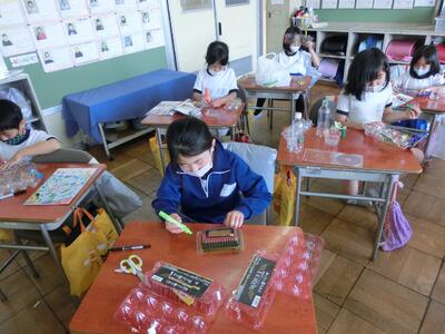 図工「ひかりのプレゼント」で、色を付けた透明容器に光を通して、形や色を作り出しました。容器に水を入れて揺らしてみたり、光を通す角度を変えてみたり、台の上に影を作ってみたりして楽しみました。「見て見て!こうすると、きれい!」と発見した光のプレゼントを教え合っていました。