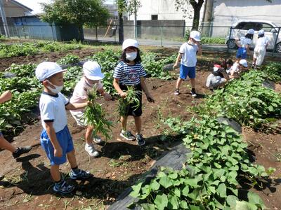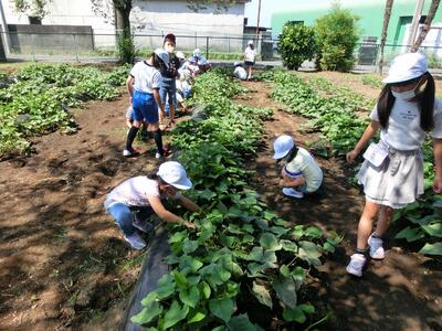 農園のサツマイモがだいぶ育ってきたので、草取りをしました。ちょうど国語の学習で「サツマイモのそだて方」を勉強したので、子どもたちも草取りの大切さをよく理解していました。サツマイモの葉の形を確認しながら、一生懸命に草取りをしていました。