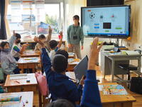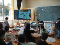 市のICT支援員の先生にプログラミングを教えてもらいました。自分のタブレットパソコンを使って、生き物の動きや形を指定して自由に動かしました。自分が命令したように動く画面を見て感動していました。