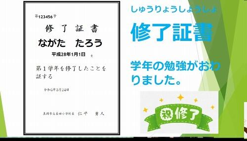 さて、今日は修了式です。今、学年の代表の人に、修了証書を手渡しました。修了証書には、その学年の勉強を修める(全部、学んだこと)ことができましたと書かれています。