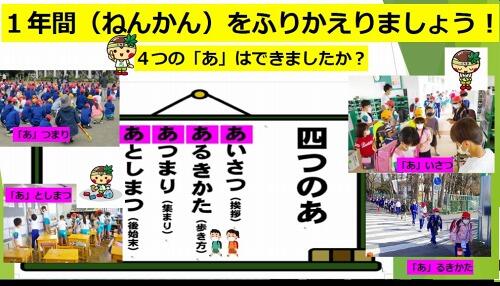 4月から、皆さんはそれぞれ学年が一つ上がり、進級します。来年も、長田小の「あいうえお」をしっかり守って、頑張ってほしいと思います。